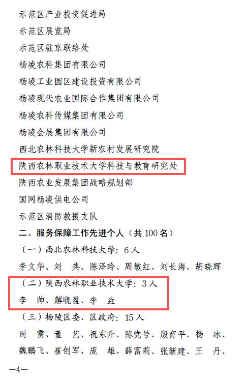 近日,第三十二届中国杨凌农业高新科技成果博览会筹委会向学校发来感谢信,对学校在农高会中的贡献表示高度认可与衷心感谢。同时,中共杨凌示范区工委、杨凌示范区管委会联合发布《关于表彰第三十二届农高会服务保障工作先进集体和先进个人的决定》,学校科技与教育研究处获评“服务保障工作先进集体”,李帅、解晓盈、李垚三位老师获评“服务保障工作先进个人”。