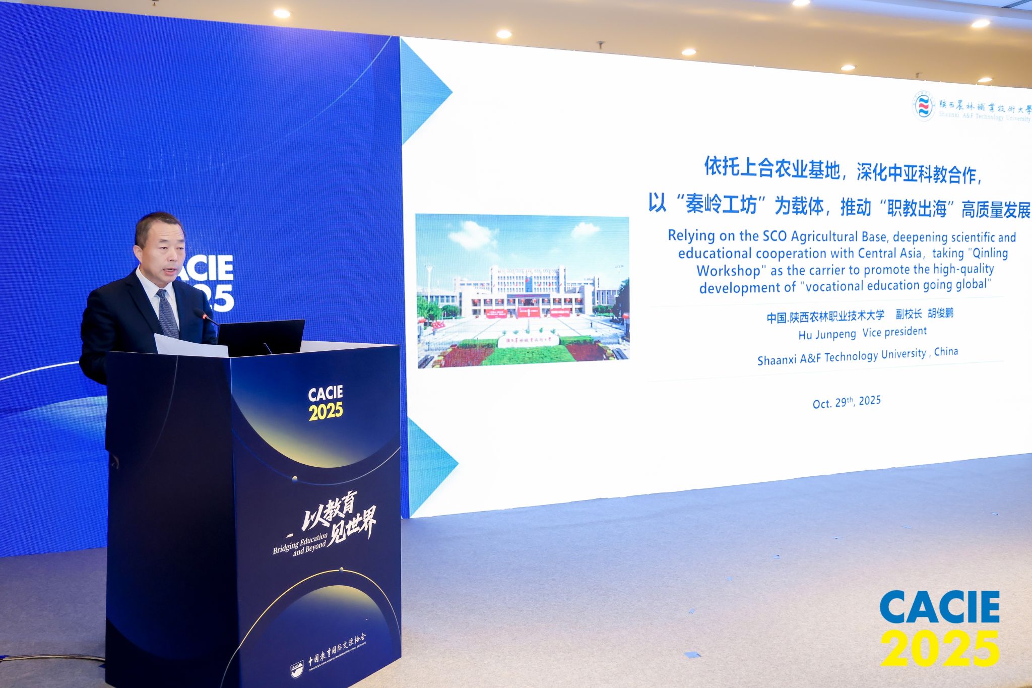 在中国—中亚职业教育合作研讨会暨中国—中亚产教融合联盟2025年会上,胡俊鹏以“依托上合农业基地,深化中亚科教合作,以‘秦岭工坊’为载体,推动‘职教出海’高质量发展”为主题,分享了学校中亚合作案例,介绍了学校与中亚国家在专业及课程标准分享、现代农业技术培训、国际学生培养等方面的国际合作成果,表示要以“秦岭工坊”项目为抓手,通过“引融联建享”的方式破冰国际合作困境,提高校企国际合作效率。在“教随产出,校企同行:构建‘双智’国际人才培养新生态”论坛圆桌对话环节,国际合作交流处介绍了学校国际合作的基本情况,表示在国际合作背景下校企要互相借力、发力、合力,开展密切合作、相互赋能。