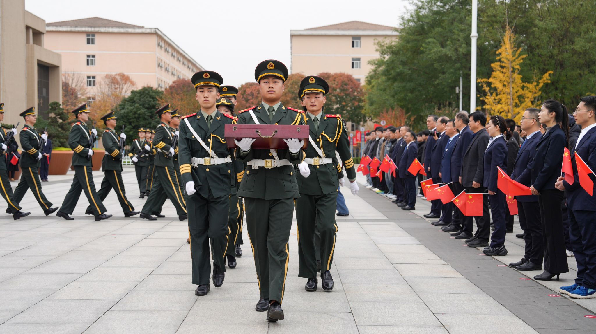 上午10时,仪式在雄壮的国歌声中正式开始。党委书记韩明军郑重宣读了由北京市天安门管理委员会颁发的获赠证书。他介绍,10月31日,北京市天安门管理委员会向学校赠送了2025年6月9日在天安门广场升挂的国旗。6月9日当天,天安门广场天气晴朗,风和日丽,该面编号为2025-0160的国旗,长5米,高3.3米,重1800克,整幅旗面无拼接,五颗五角星采用人工丝网印染工艺,于当天上午4时46分在天安门广场冉冉升起、迎风飘扬。国旗是国家的象征和标志,天安门广场升挂的国旗具有唯一性和特殊的历史价值,是蕴含特殊意义的爱国主义教育载体,承载着亿万中华儿女深厚爱国情怀。值得特别铭记的是,2025年6月9日也是教育部发文批准设立陕西农林职业技术大学之日,获赠2025年6月9日在天安门广场升挂的国旗,是对学校办学91年最好的总结,也承载着国家对陕西农林职业技术大学的殷殷期望,我们一定按照习近平总书记的嘱托,矢志强农报国,努力培养更多知农爱农的专业人才,为建设农业强国、推进中国式现代化作出新的贡献。