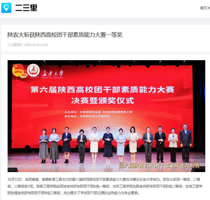 10月12日,由团省委、省委教育工委主办的第六届陕西高校团干部素质能力大赛总决赛在长安大学举办。陕农大斩获一等奖、二等奖、三等奖各1项。信息工程学院赵朋波老师获专职团干部B组一等奖;水利工程学院刘晗老师获专职团干部B组二等奖;生物工程学院张惺老师获专职团干部B组三等奖,充分展示了学校团干部过硬的业务能力与专业素养。