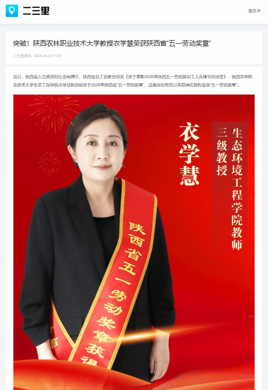 近日,陕西省人力资源和社会保障厅、陕西省总工会联合印发《关于表彰2026年陕西五一劳动奖和工人先锋号的决定》,陕西农林职业技术大学生态工程学院衣学慧教授被授予2026年陕西省“五一劳动奖章”,这是该校有史以来获得的首枚省级“五一劳动奖章”。