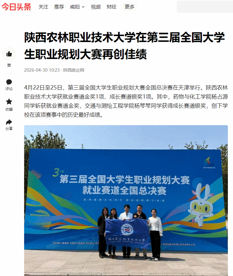 4月22日至25日,第三届全国大学生职业规划大赛全国总决赛在天津举行。陕西农林职业技术大学获就业赛道金奖1项、成长赛道银奖1项。其中,药物与化工学院杨占源同学斩获就业赛道金奖,交通与测绘工程学院杨琴琴同学获得成长赛道银奖,创下学校在该项赛事中的历史最好成绩。